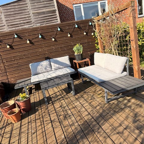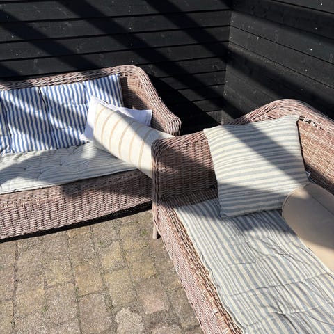 Flettet er gået lidt op, og den er lidt beskidt da den naturligvis har stået ude, det kan dog taget med en klud eller man kan vaske hynderne. Det sælges derfor billigt.