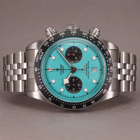 Flot eksemplar af den populære Tudor Black Bay GMT ‘Pepsi’ med den eftertragtede hvide skive. Uret er udstyret med Tudors in-house automatiske værk, Calibre MT5652, med GMT-funktion, COSC-certificering og 70 timers gangreserve med en garanteret vandtæthed ned til 200 meter. Dette eksemplar står nær ubrugt med få hairlines.