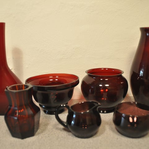 7 drikkeglas hvoraf 6 er mere vandglas og det stor røde er sodavand.