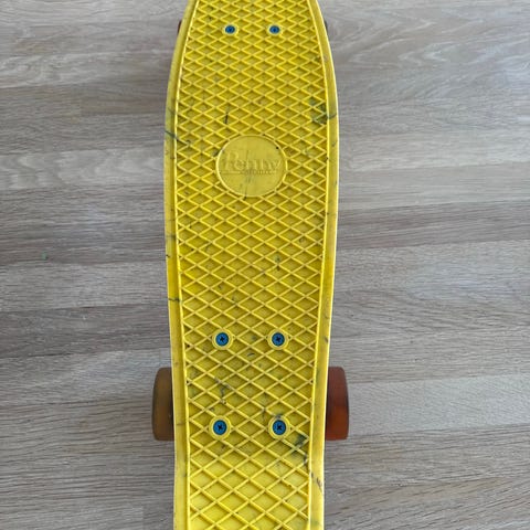 Penny skateboard i plast med gennemsigtig gul deck. Boardet måler ca. 56 cm i længden. Mønsteret på decket giver ekstra fodfæste. Monteret med trucks og hjul, der også har en gul/grøn gennemsigtig tone. Egnet som kompakt cruiserboard til kortere ture og transport.
