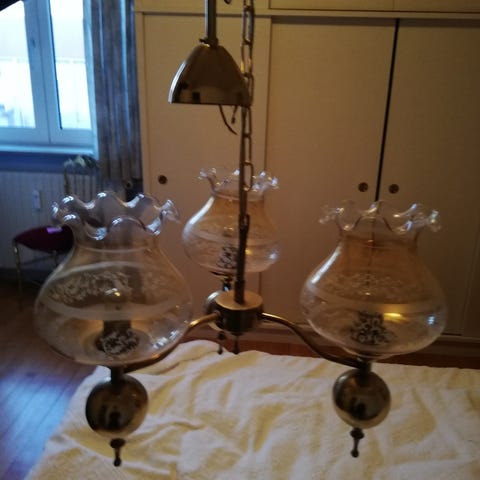 Lille rund messing loft lampe fra H&M Home med sort stof ledning. Aldrig været brugt. I fuldstændig hel stand uden buler eller mærker. Er købt for ca 5 - 6 år siden, men har ikke fundet plads til den.