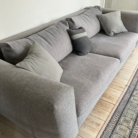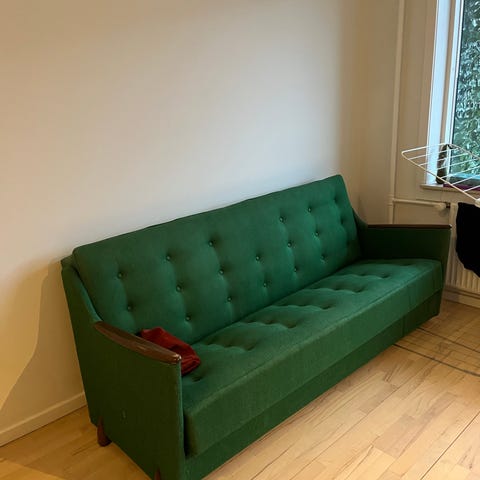Folds in half and can be used as a couch. Or, comfortable to sleep when flat (as shown in picture). Mattress topper available for free (in picture). Very comfortable to sleep with mattress topper. 120 x 190