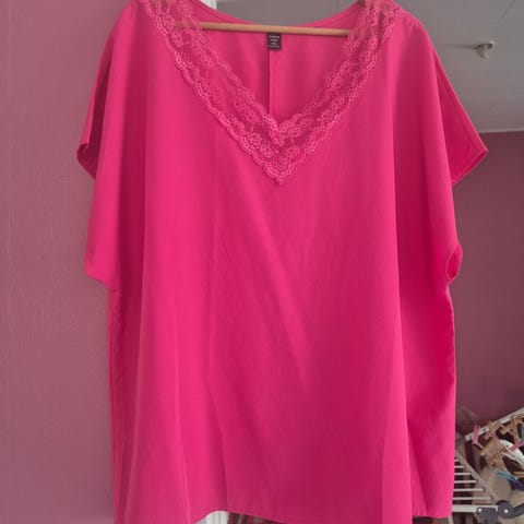 Lilla bluse med lange ærmer og 3 knapper til pynt foran. 72% polyester og 28% viscose. Str. 4xl. Brugt en enkelt gang . Pris 50 kr.