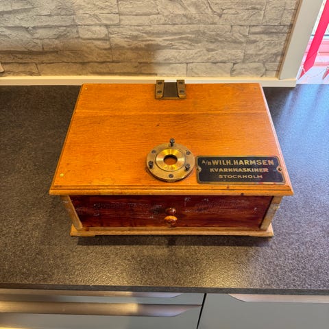 Flot humidor i mørkt træ med glas, skuffer og indbygget hygrometer. Fungerer godt og egner sig fint til opbevaring af cigarer.