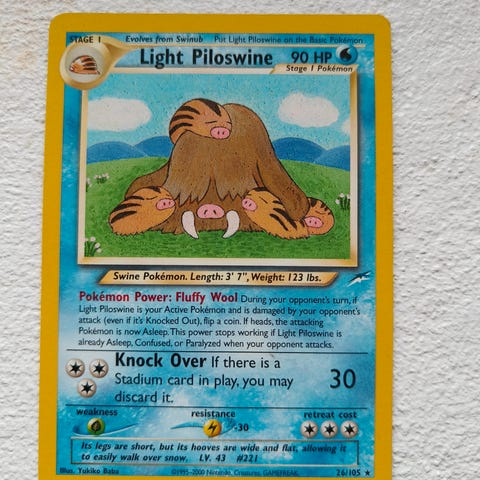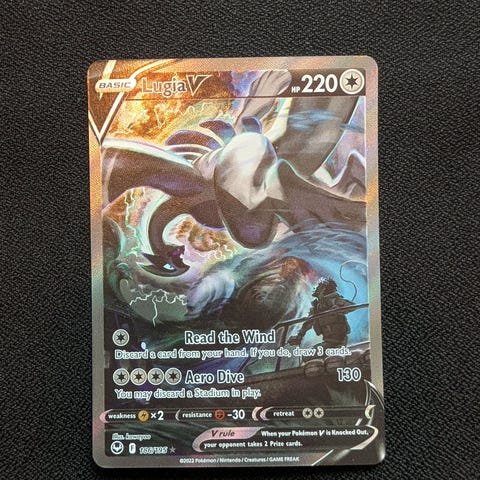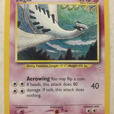 Sælger denne ikoniske 1st Edition Lugia. Kortet har en fantastisk flot forside (eye appeal), men har et lille hak/dent øverst og noget whitening på bagsiden. Perfekt til samleren, der vil have den vildeste "binder copy", uden at skulle betale 30.000+ for en graderet udgave.