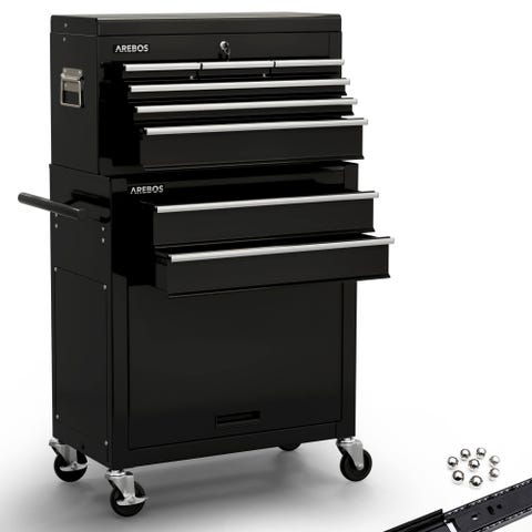 AREBOS-værktøjsvognen er lavet af robust stål. De udtrækkelige skuffer er fyldt med et værktøjssortiment på 81 dele og tilbyder dig et omfattende udvalg af kvalitetsprodukter til værkstedsbehov. Åbning og lukning er let takket være de kuglelejrede skuffer. De har en låsefunktion, så de ikke åbner af sig selv. Skridsikre måtter sikrer, at værktøjet bliver på plads.