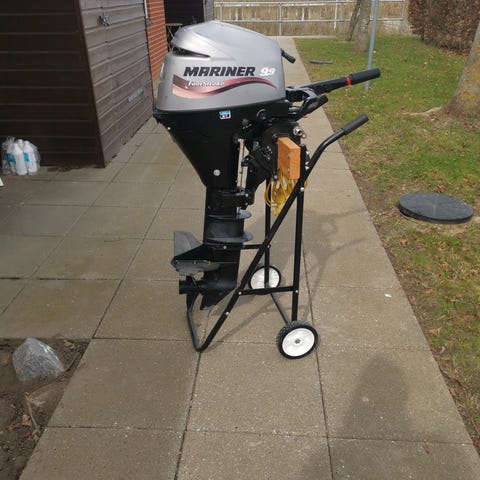 Mariner 15 hk påhængsmotor. Benzindrevet motor egnet til mindre både. På billedet ses motoren monteret på en transportvogn samt med separat brændstoftank og tilhørende slange. Velegnet som primær motor eller reserve-/jolle-motor til fritidssejlads.