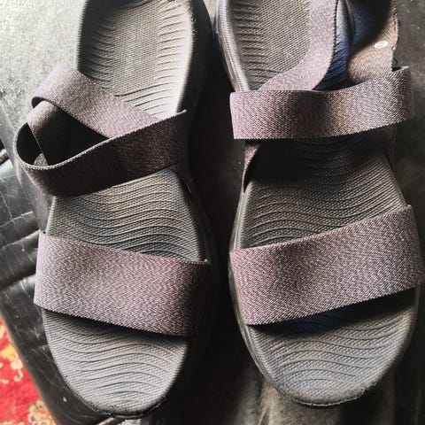 Skechers sandaler i str. 40. Åbne sandaler med justerbare remme over forfod og om anklen. Farven fremstår som blå. Sandalerne har polstret fodseng og let sål, egnet til hverdagsbrug i varmt vejr.