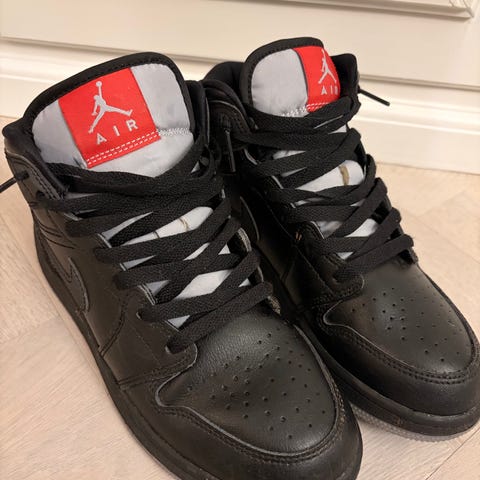 Nike Air Jordan sneakers til dreng i str. 34. Høj model med snørelukning. Overdel i syntetisk materiale og tekstil i sort og grå med røde detaljer. Indvendig polstring omkring ankel og pløs for komfort. Ydersål i rød gummi med mønster for greb. Velegnet som hverdagssko eller fritidssko til børn.
