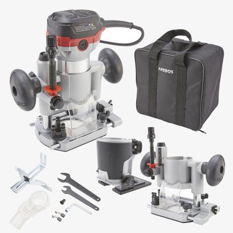Guhdo fræsehoveder og fræseværktøj til træbearbejdning. Sættet omfatter flere fræsehoveder i metal, herunder rødlakerede profileringshoveder samt runde hoveder med udskiftelige skær. Der medfølger diverse tilhørende dele som tandhjul, afstandsstykker og andre metaldele til montering og brug i træbearbejdningsmaskiner. Velegnet til brug i fræsemaskiner og lignende udstyr til bearbejdning af træprofiler og samlinger. Meget værktøj til fræser inkl. helt nye bokse til kam- og rammetræ.