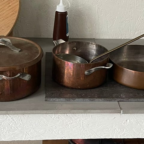 4 kobbergryder. Den lille er fra Georg Jensen. Den store og en af de mellemste er fra Frankrig og den sidste ved jeg ikke.