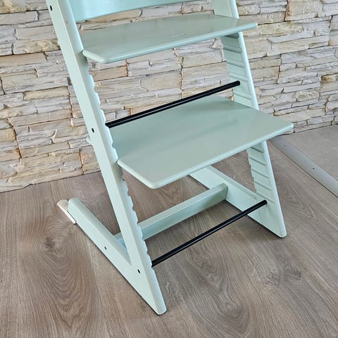 Stokke højstol i flot grøn farve. Klassisk træhøjstol fra 2014 med justerbart sæde og fodplade, der kan tilpasses barnets højde.