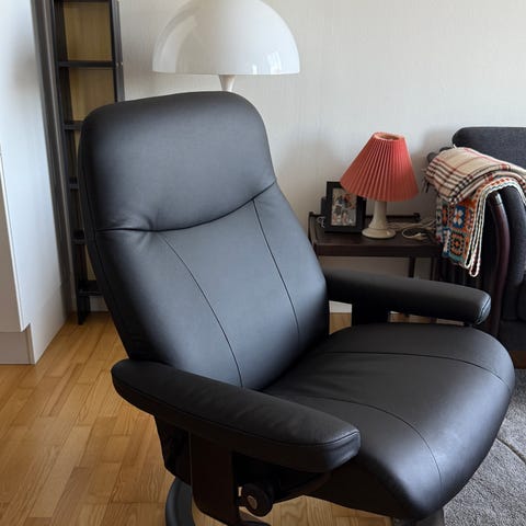 Stilren lænestol fra Stressless. Stolen er betrukket i deres slidstærke okselæder i sort og står på et flot stel i sortbejdset træ og poleret metal. Stolen giver både en god siddekomfort samt et flot look.