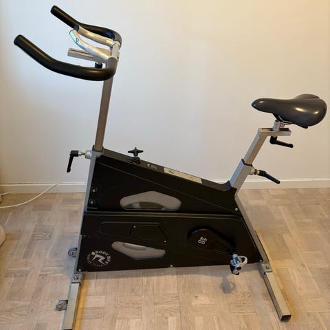 Spinningcykel med justerbar saddel og styr. Cyklen har rem- eller kædetræk med svinghjul foran og pedaler med tåstropper. Egnet til indendørs træning og konditionstræning i hjemmet eller i mindre træningsrum. Konstruktionen er i metal med stabil base og manuelt justerbar modstand via drejeknap. Smuk cykel brugt til kampagne.