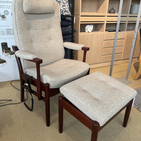 Tidsløs lænestol med en god siddekomfort. Stolen er betrukket med et godt og slidstærk stof og står på et elegant stel i sæbebehandlet egetræ. Prisen er inklusiv nakkepude og armbakker.