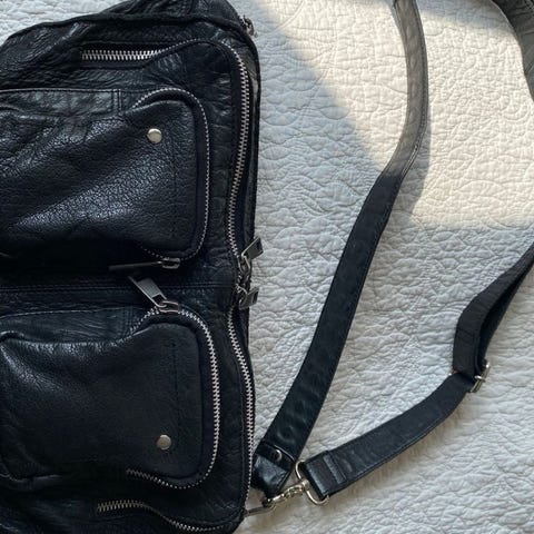 Hovedrummet lukkes med lynlås og har indvendig lynlåslomme. Justerbar og aftagelig skulderrem i matchende materiale.