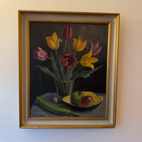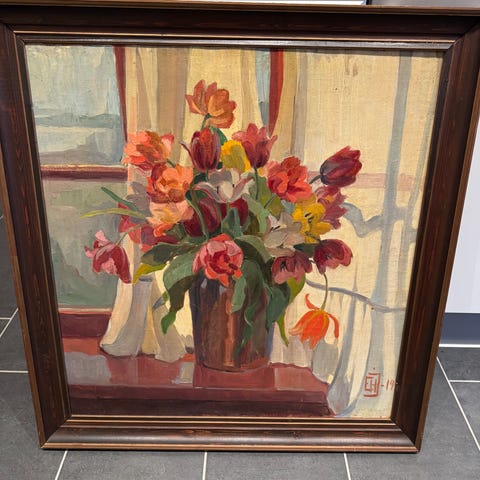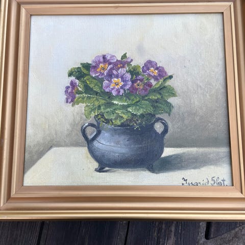Maleri stilleben med blomster i hvid ramme