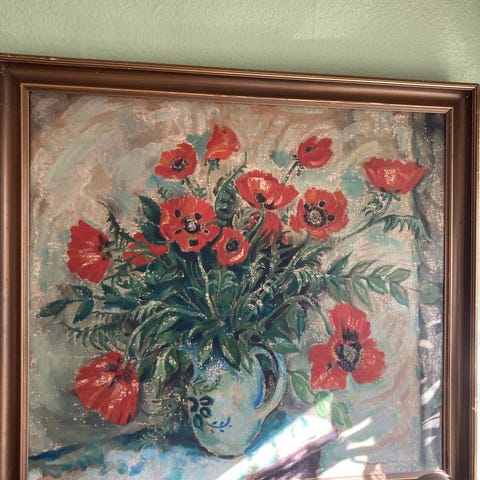 Maleri med motiv af blomster i en grøn vase.