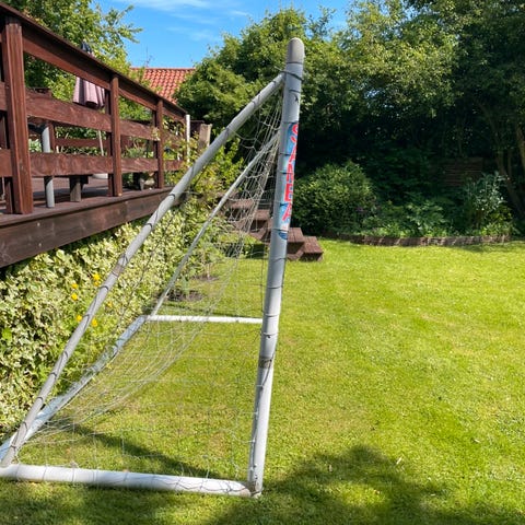 Fodboldmål i metal til udendørs brug. Målet har kraftig metalramme og net monteret på bagsiden. Velegnet til have, legeplads eller mindre boldbane til fodboldtræning og leg. Kan placeres direkte på græs eller jord og bruges af både børn og voksne afhængigt af størrelse og behov.