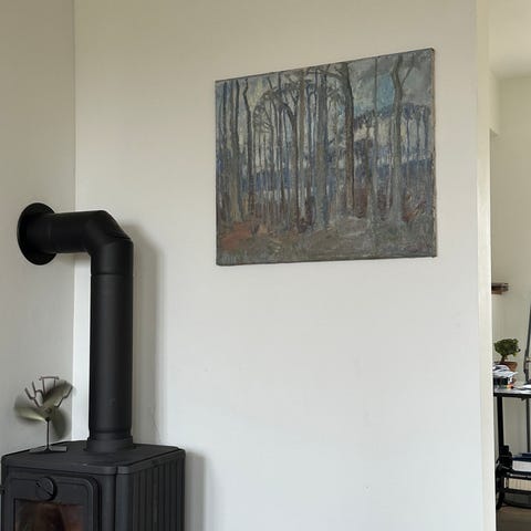 Motivet viser træer, sten og bevoksning i dæmpede, naturlige farver.
