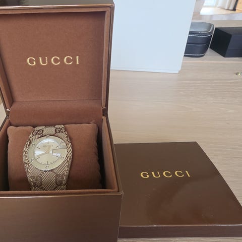 Jeg sælger mit ubrugte og ekslusive Gucci ur i ny stand, som aldrig er båret. Dette 100% ægte og autentiske ur fra Guccis kollektion (kig vedhæftet billeder for kvitteringer eller skriv til mig privat) som er virkelig værdifuldt og stilfuldt til enhver.