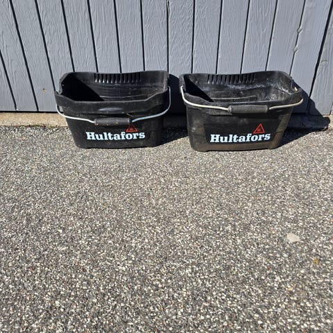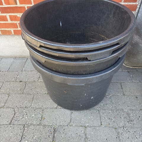 Spande i sort plast med hank - brugt til transport af store mængder murbrokker, jord med mere i forbindelse med renovering. 60 stk. sælges samlet for 150kr