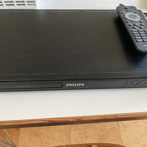 Philips dvd-afspiller i sort. Enheden er egnet til afspilning af dvd-medier til brug sammen med tv eller andre skærme med kompatibel tilslutning. Leveres med fjernbetjening som vist på billedet, hvilket giver mulighed for betjening på afstand. Velegnet til hjemmeunderholdning, film og anden videoafspilning via dvd.