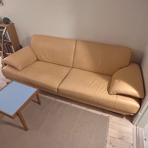 Natuzzi Bourdeux lædersofa med læderpuder og en tilhørende Natuzzi puf i samme læder.