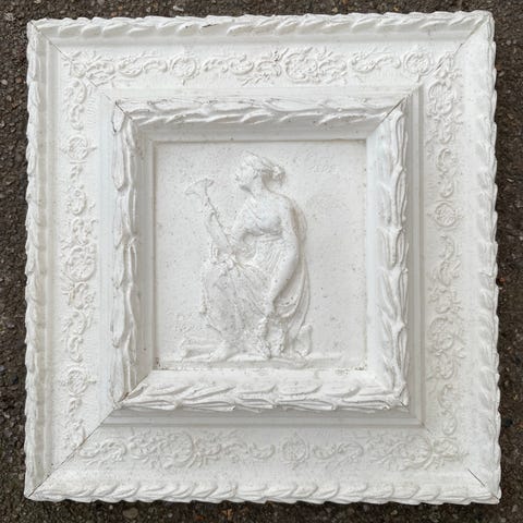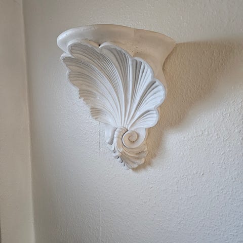 Væghylde med englemotiv i gips. Hylden er udformet med to engleansigter og dekorative detaljer på fronten. Farven er hvid/lyst natur, og materialet fremstår som støbt gips eller lignende komposit. Bagsiden er plan til montering på væg. Egnet som lille dekorativ væghylde til f.eks. lys, små figurer eller andre pyntegenstande i hjemmet.