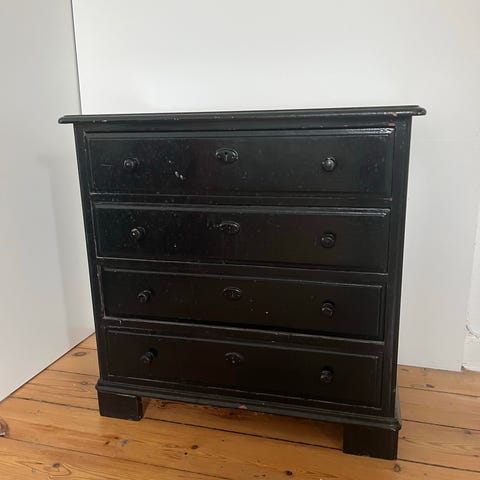 Vi sælger vores gode, gamle kommode. Den er sort, har 7 skuffer med nye greb. Der er skallet en smule af malingen på toppen (se billede).