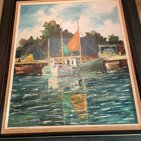 J.P. Nielsen maleri med motiv af fiskekutter i søgang. Billedet viser en kutter på havet under overskyet himmel i dæmpede farver. Maleriet er signeret i nederste hjørne og monteret i klassisk træramme med navneskilt i messing med teksten “J.P. Nielsen”. Velegnet som vægudsmykning i stue, kontor eller sommerhus med maritimt tema.