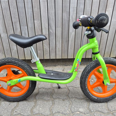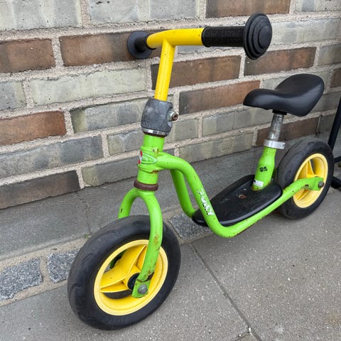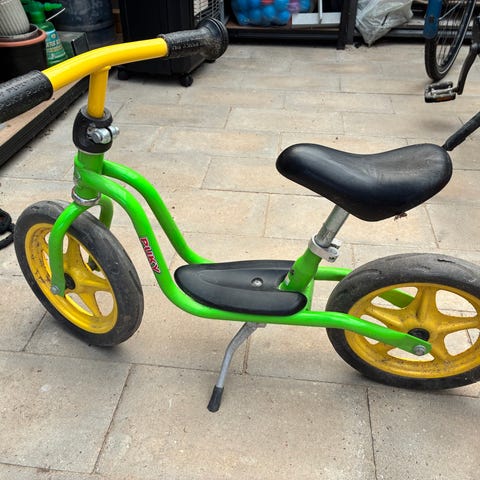 Sælger denne lime grønne børnecykel i str. 2-3 år. Styrestang medfølger.