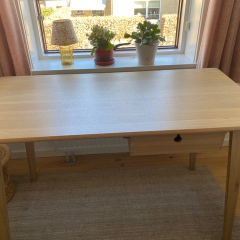Fint skrivebord i bambus fra Jysk. Det er en udgået model. Bordpladen har nogle ridser, som ses på billedet. Fint skrivebord til det lille kontor