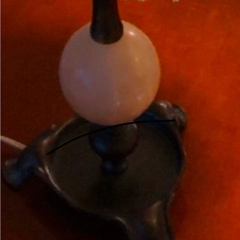 Lampen er meget tung. Der er 5 lampetter. De kan slukkes/,tøndeslagning individuelt. De er i sort med meldinger inden i. Base i marmor. Med messing detaljer. Måler ca 80 cm i diameter og højden er ca 27 cm. Den har nu en ledning + loftholder på ca 80 cm.