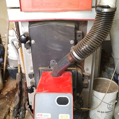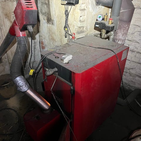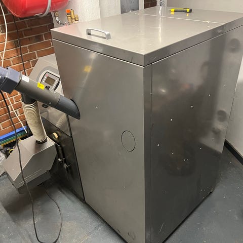 Hjemmebygget pillefyr med tank, kan monteres på enhver kedel. Kedlen kan eventuelt medfølge.