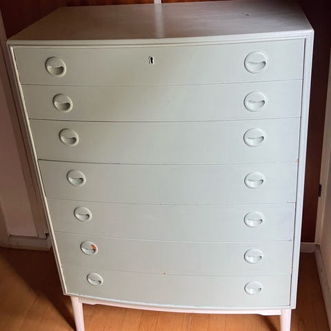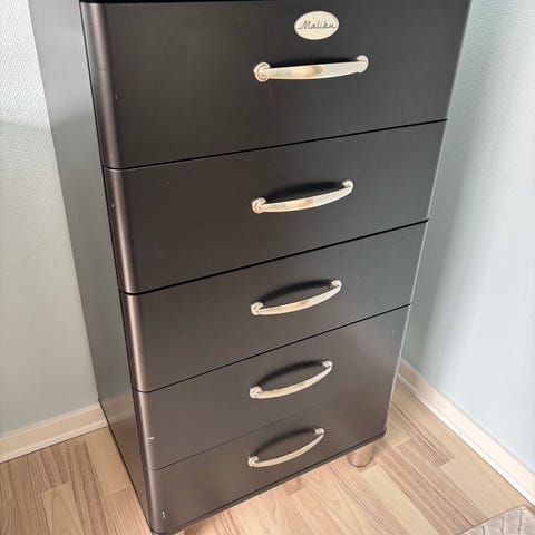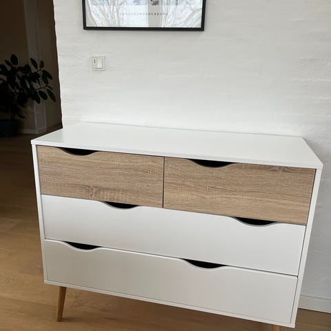 Pæn, solid og rummelig kommode fra Ilva i hvidt træ med fem skuffer.