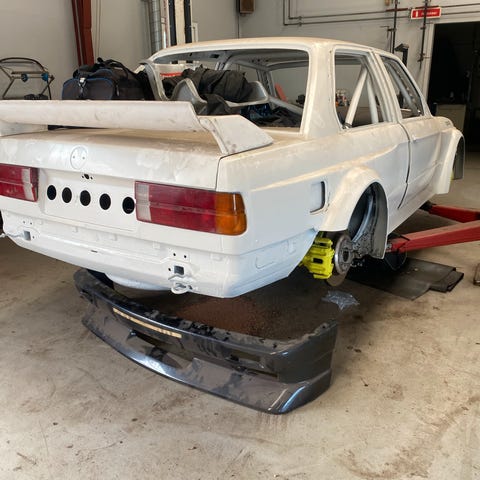 BMW rat med forskellige emblemer og pins monteret på indersiden. Rattet har klassisk BMW-logo i midten. Emblemerne og pinsene er af blandet oprindelse og motiv og kan anvendes til dekoration, samling eller som udstillingsobjekt sammen med rattet.
