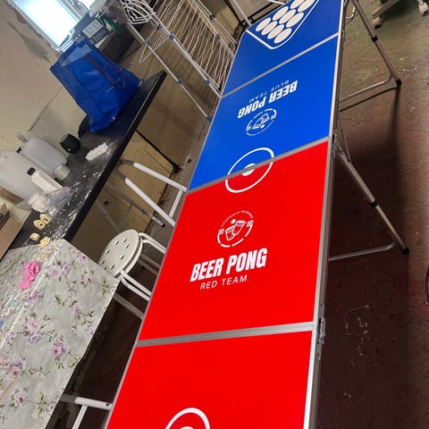 Beerpong bord 240 x 60cm. Der er en lille plast flig på ca 0,5cm der er gået op. Kan evt limes.