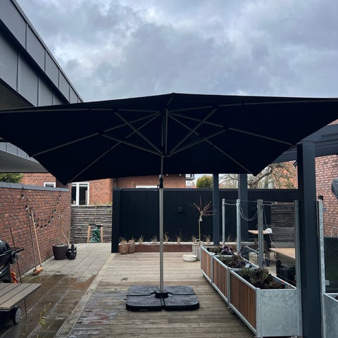 Sidehængt parasol, sort til terrasse eller have incl sort fod, beton.