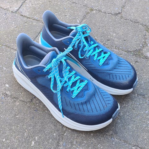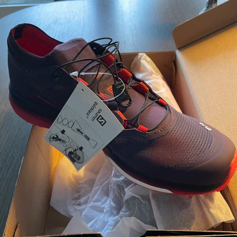 Salomon sko i størrelse 43 1/3. Skoene er sorte med lyse detaljer og har hurtigsnørelukning.