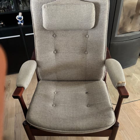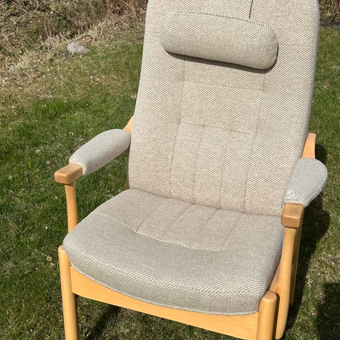 Lænestol af ældre dato, men læne funktionen fungerer som den skal og du kan nemt læne ryglænet tilbage ved at tage fat i håndtaget på siden.