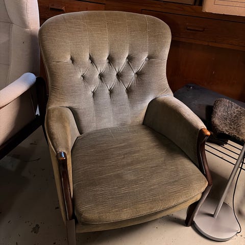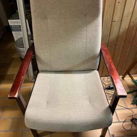Træet på armlænene har fået slidt meget af farven af yderst, men træet fejler ellers ikke noget.