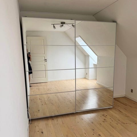 Skabene er høje og rummelige. Der medfølger bøjlestænger og hylder som vist på billederne (skabene er indrettet ens). På den ene låge i det ene skab er der et spejl på indersiden. Der er ingen bagbeklædning på skabene, og lågerne er har lidt brugstegn(se billeder), hvorfor det hele sælges samlet til 1200 kroner.