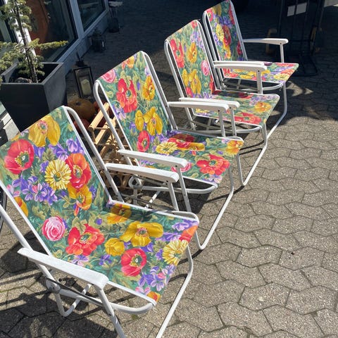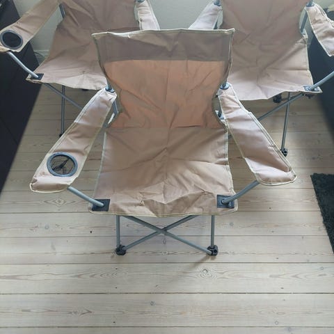 Sammenklappelige campingstole i gråt tekstil med mønster. Stolene har armlæn og metalstel med ryglæn, der giver støtte til ryggen. Velegnet som havestole eller campingstole, der nemt kan klappes sammen og opbevares eller transporteres i bil eller campingvogn.