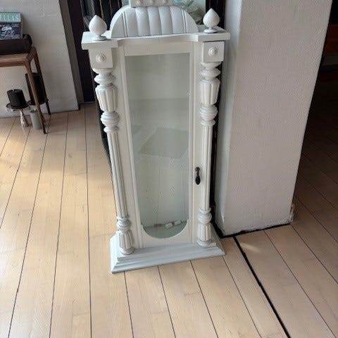 Vægskab, Decouise.dk, Skab til væg som består af to gammel trækasse og gammel skabslåge. Der er ruder i lågen og hønsetråd bag. Der er nyt metalgreb på lågen. Skabet er behandlet over det hele. Det kan derfor både hænge ude som inde og i vådrum. Mål: Højde 62 cm, bredde 25 cm og dybde 15,5 cm.