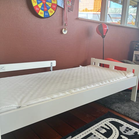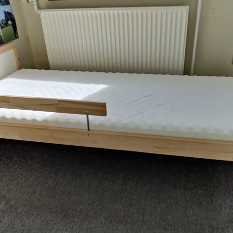 IKEA børneseng i træ. Sengen har en enkel ramme i lyst træ med sengehest på siden. Den er velegnet som overgangsseng mellem tremmeseng og almindelig seng til børn. Madrassen på billederne viser, hvordan sengen kan anvendes, men medfølger kun, hvis det er angivet i annoncen. Sengen er egnet til brug i børneværelse som soveplads for mindre børn.