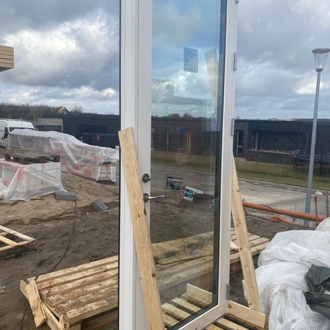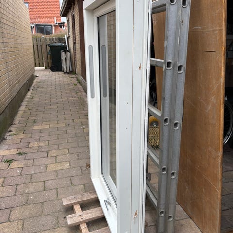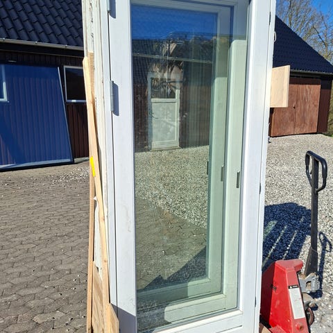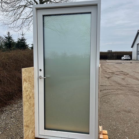 Uden mærke glasdør til udendørs brug i Døren består primært af et stort glasfelt i en smal karm. Egnet til montering som terrassedør eller havedør, hvor der ønskes meget lysindfald. Farven er hvid i plast Velegnet til brug i bolig, udhus eller lignende, hvor der er behov for en glasdør. Med vippe /side ind. Str 96 x 200cm