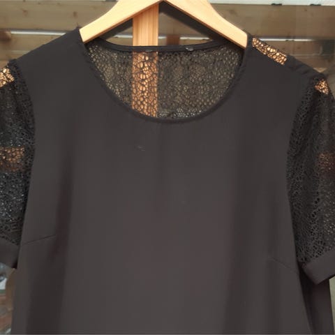 Blusen har halve trompetærmer og 8 stropper oppe ved halsen hvoraf der så skal sidde 4 på hver side af halsen som dermed "dekorere" dit kraveben flot.