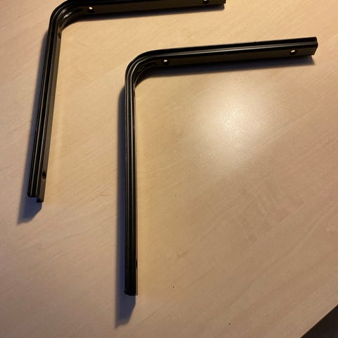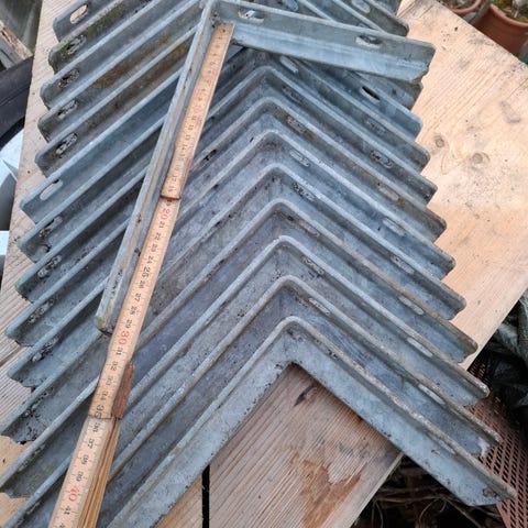 11 Hylde knægte i sort L-formede beslag med forborede skruehuller til montering på væg og under hylder. Egnet til opsætning af hylder pr. stk. 20kr.