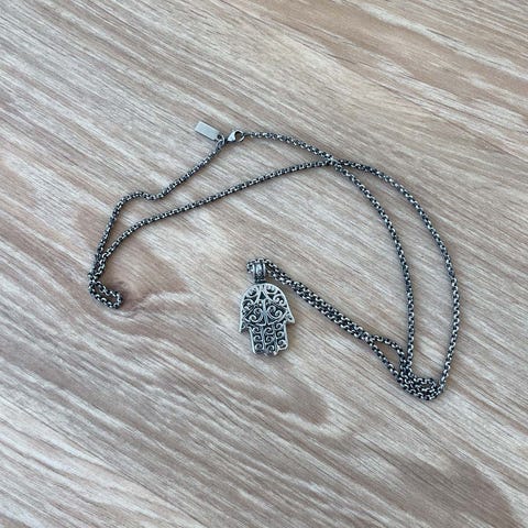 Halskæde (ikke ægte). 36,5 cm lang med vedhæng. Vedhænget er 3,5 x 4,5 cm.